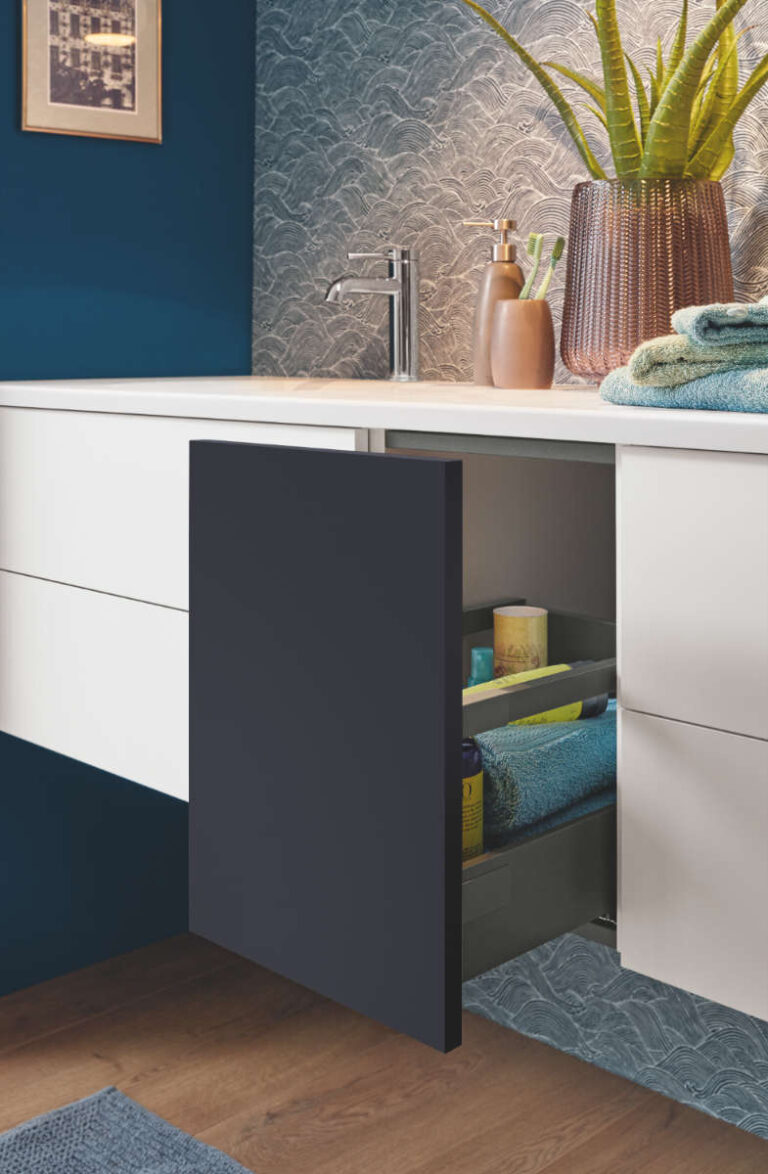 Tutta la ferramenta è del Marchio Blum, con Sponde del cassetto in alluminio e tutti i sistemi di chiusura ammortizzata BluMotion.