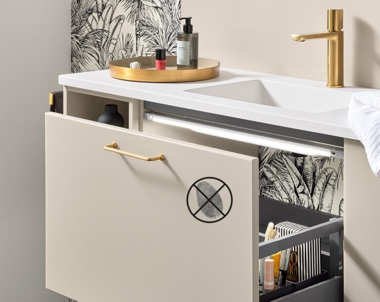 Badea propone diverse finiture per i frontali e i corpi dei mobili, il classico laminato opaco, laminati opachi anti impronta, o laminati laccati lucido.