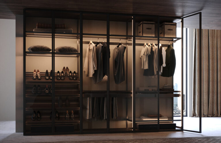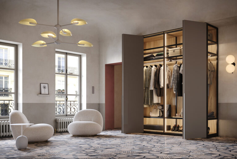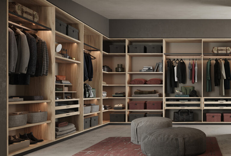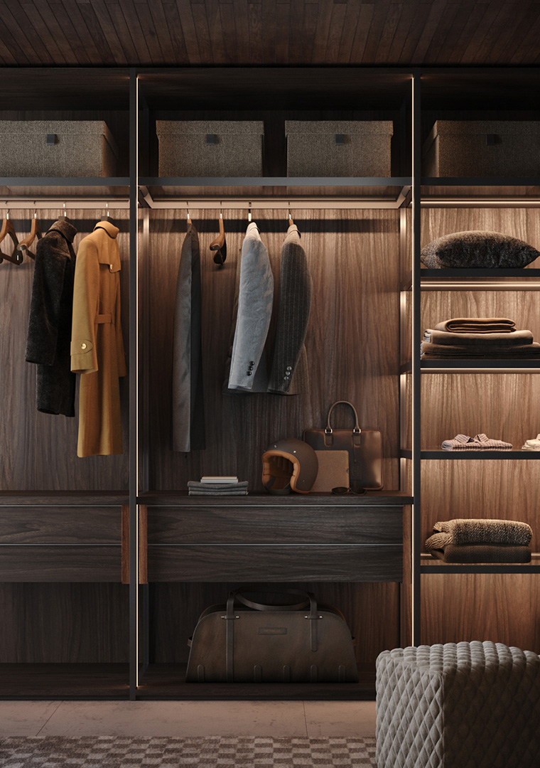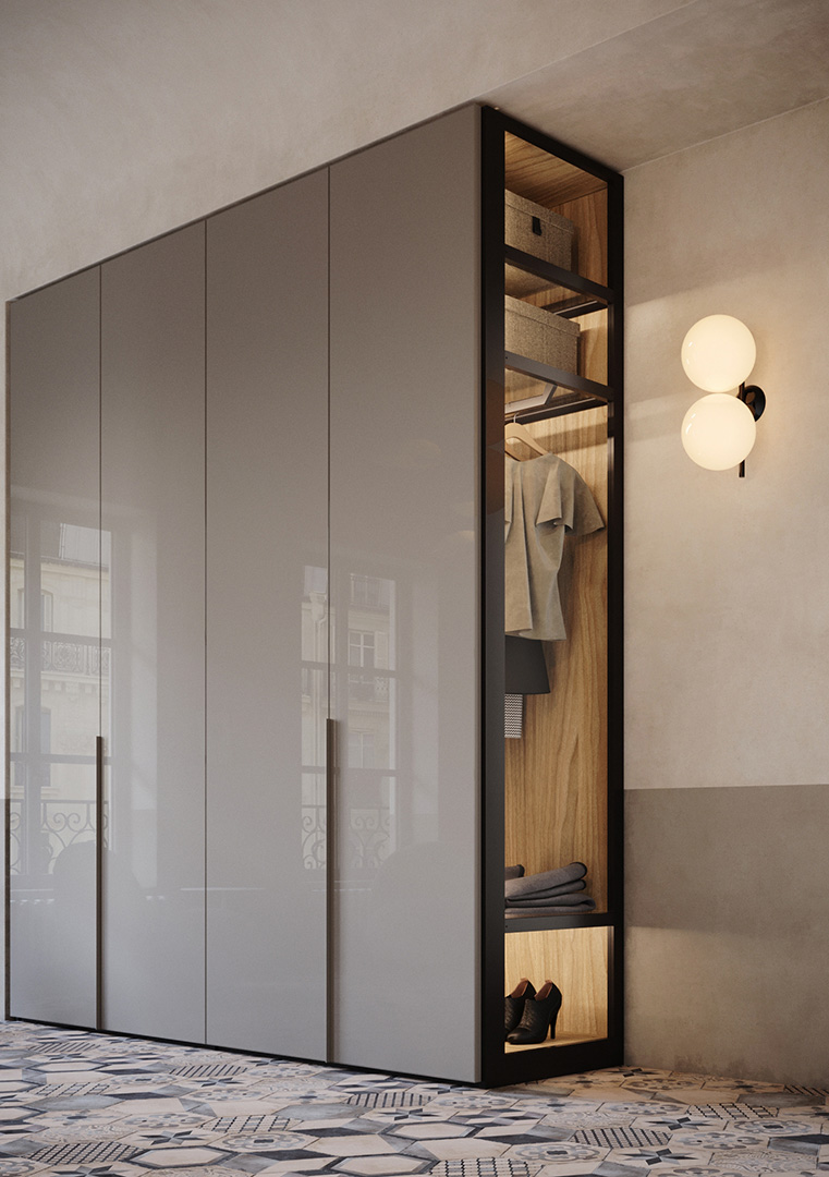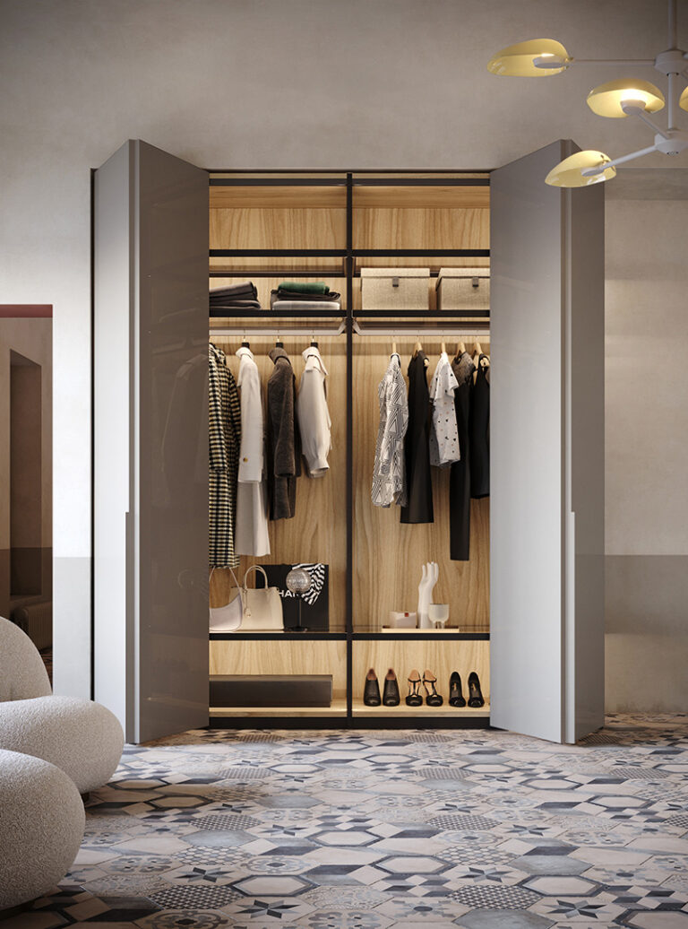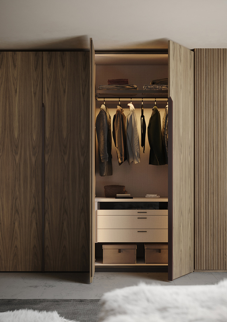 Ogni armadio può essere personalizzato nelle dimensioni e nell’ attrezzatura interna.Le aperture delle ante disponibili sono 3, apertura con ante a battente, a soffietto o mediante porte scorrevoli. Tutte le soluzioni hanno i meccanismi con apertura7chiusura ammortizzata.