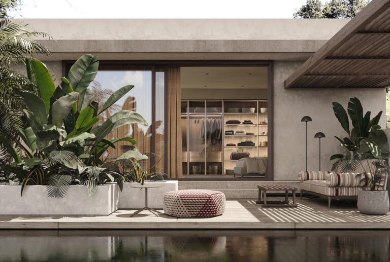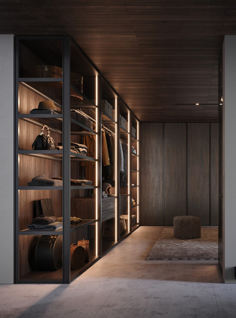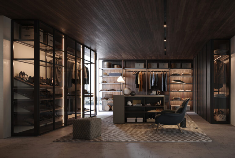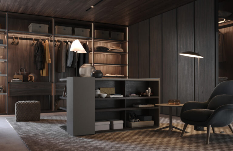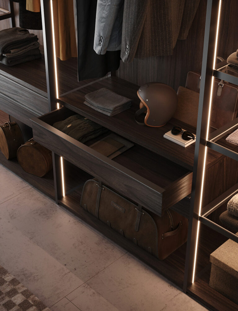Oltre agli armadi, Radice propone anche A-Dock un sistema di pareti attrezzati ideati per le cabine armadi o arredamento della zona giorno con elementi interamente sospesi.